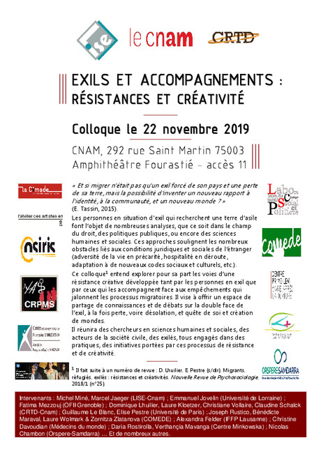 colloque " Exils et accompagnements: résistances et créativité », le 22 novembre 2019 au Cnam, 292 rue Saint Martin Paris 75019