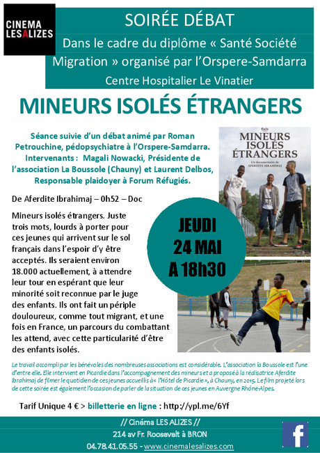 Dans le cadre du DIU Santé, société et migration, l'Orspere-Samdarra organise une soirée ciné-débat autour du film documentaire « Mineurs isolés étrangers », d’Aferdite Ibrahimaj, le 24 mai 2018 de 18h30 à 20h30. Cette soirée sera co-organisée avec le cinéma les Alizés de Bron.