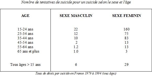 Sur le plan épidémiologique la différence principale observée pour les suicidés et les suicidants est liée au sexe: la tentative de suicide est majoritairement féminine et la mort par suicide majoritairement masculine.