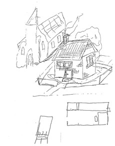 Le dessin de la maison avec l'église (C) est d'un autre ordre graphique et dans un autre registre psychique[2]. Cependant, comme l'église et la chambre de foyer, la maison est dessinée en priorité par ses contours, comme si l’espace devait être circonscrit par le trait. Il repasse sur les traits, comme pour accentuer cette fonction de limite. A l’image de sa circulation dans l’espace de la ville, il montre sa nécessité de tracer, par le contour, un espace qu’il peut ensuite remplir (d’objets, de paroles ou de gestes, de traits pour le dessin). Le contenu peut être représenté à partir du contenant (W.R. Bion, 1962). Autrement dit, c’est l’enveloppe externe qui détermine le contenu.