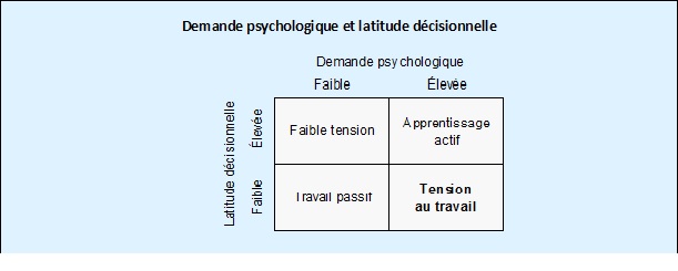 Selon plusieurs théories, l’exposition à certains facteurs de risques psychosociaux au travail peut avoir des conséquences négatives sur la santé mentale des travailleurs. Le modèle de la tension au travail (également appelé modèle « exigence-contrôle ») et le modèle « effort-récompense » sont les deux modèles de référence pour mesurer le stress au travail et ils permettent d’identifier les caractéristiques spécifiques à l’emploi qui exercent une influence sur le bien-être et la santé mentale des salariés. Le modèle exigence-contrôle est fondé sur le principe selon lequel le stress et la tension au travail sont liés, en premier lieu, aux caractéristiques structurelles/organisationnelles de l’environnement de travail (Karasek, 1979). Plus précisément, ce modèle établit qu’aux différents types d’emplois correspondent différents types de stress au travail, sous l’effet de trois facteurs principaux : I) le volume de travail (les exigences de l’emploi) ; II) le pouvoir de décision individuel ; et III) la marge de manœuvre dans son travail (la somme des deux derniers facteurs correspondant à la latitude décisionnelle). Les effets néfastes du stress sur la santé physique et mentale se font davantage sentir lorsque le travailleur doit faire face à une demande psychologique importante, couplée à un faible niveau d’autonomie. Selon le modèle du déséquilibre effort-récompense, la situation qui induit le plus de stress est celle où la récompense n’est pas à la hauteur des efforts fournis. Par récompense on entend récompenses financières, considération, perspectives de promotion et sécurité de l’emploi (Sigrist, 1996).