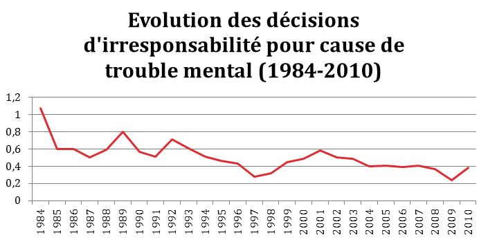 Les statistiques officielles du ministère de la justice témoignent en effet d’une chute réelle des décisions d’irresponsabilité pour cause de trouble mental (par recours à l’article 122-1 alinéa 1 2) depuis 1984 – même s’ils ne confirment pas la division par dix annoncée par le rapport Pradier.